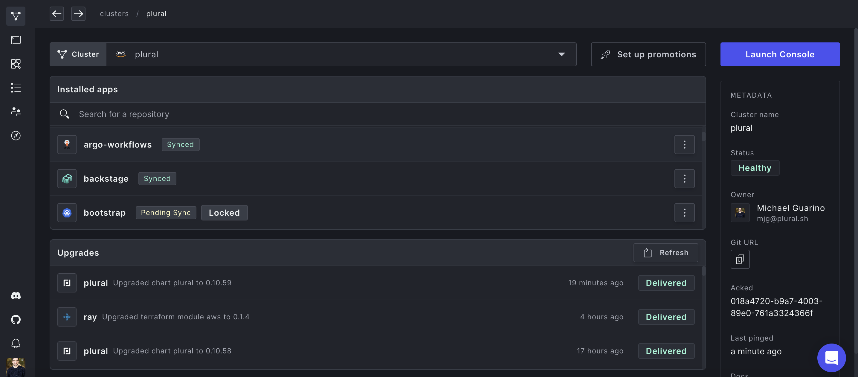 • Locked/Unlocked - This state is used when a manual change is needed. Some changes – like kubernetes upgrades or heavy app migrations – need to be applied manually and not by our console, and this state is meant to pause upgrades for that app until you explicitly mark it as having been applied with plural repos unlock <app>.
