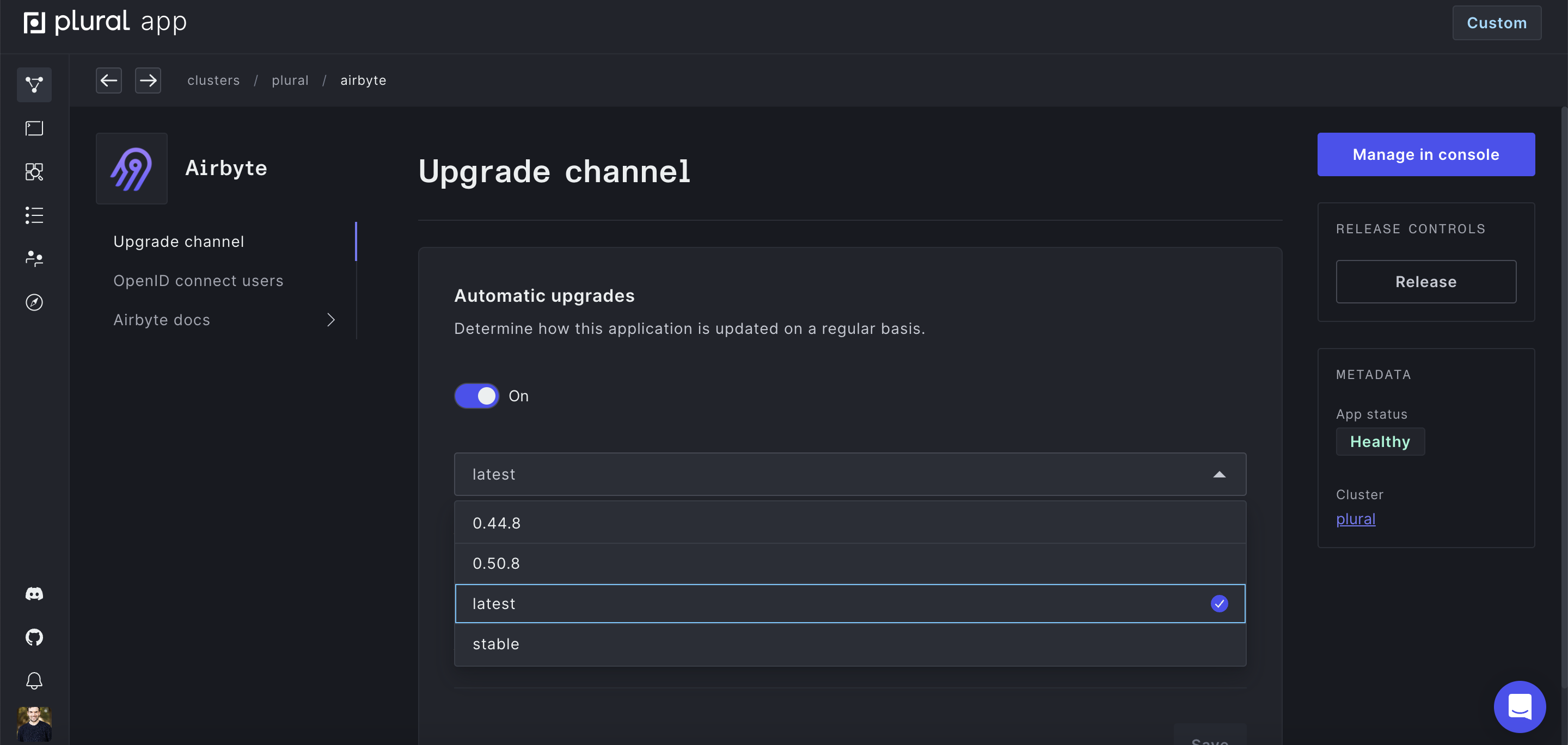 You can toggle any release channel in the /clusters page of app.plural.sh. This will often result in a lot of your installation being rewired, which will then flush to your console. Here’s an example of the upgrade channels for an airbyte installation: