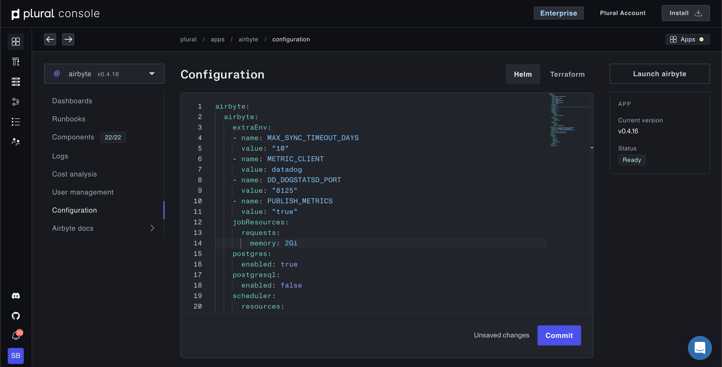 If you need to modify the Helm or Terraform for a given application, you can do so directly from the Plural Console. Navigate to the application you want to update, and click the Configuration sub-tab.